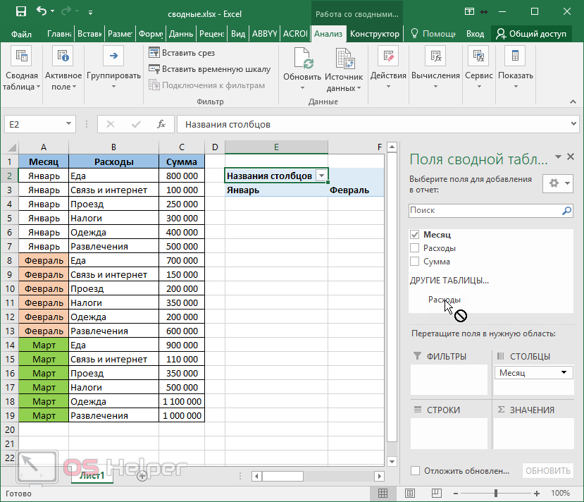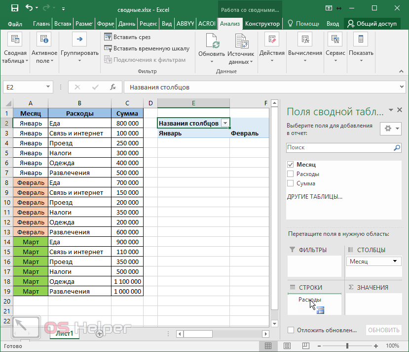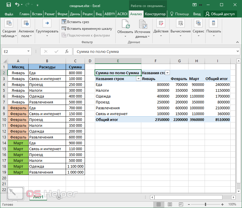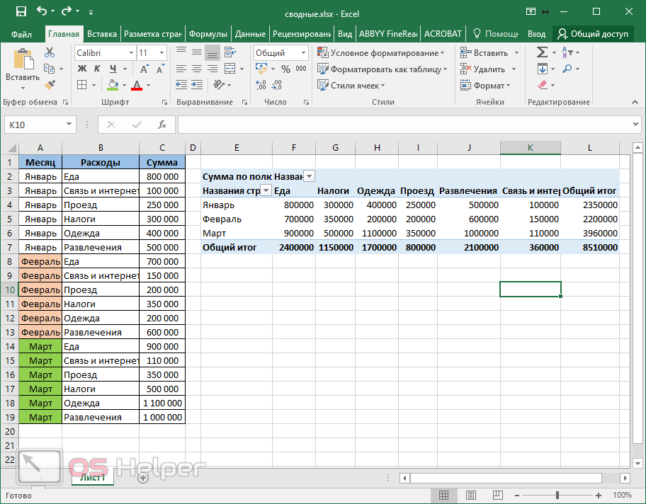 - В результате этого вы увидите следующее. При помощи этого инструмента вы сможете свести сумму расходов в каждом месяце по каждой позиции. Кроме того, доступна информация об общем итоге.
