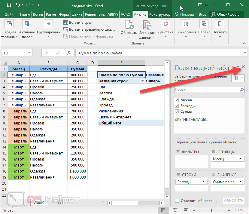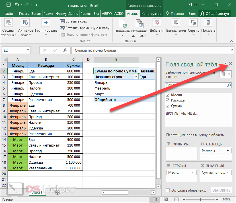 Нажав курсором на сводную таблицу появиться раздел Работа со сводными таблицами в панели инструментов