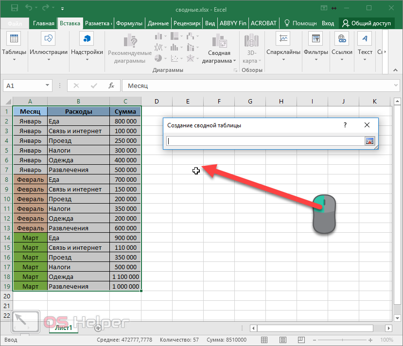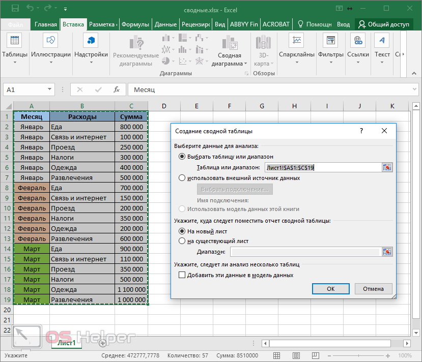 Кликаете на подходящий вариант и сводная таблица готова. Остается ее только довести до ума, так как вряд ли стандартная заготовка полностью совпадет с вашими желаниями. Если же нужно построить сводную таблицу с нуля, или у вас старая версия программы, то нажимаете кнопку Сводная таблица. Появится окно, где нужно указать исходный диапазон (если активировать любую ячейку Таблицы Excel, то он определится сам) и место расположения будущей сводной таблицы (по умолчанию будет выбран новый лист).