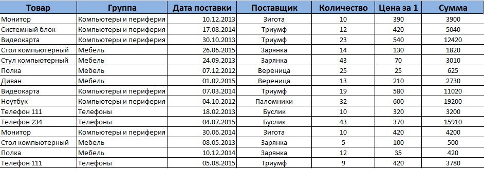 Результат: на листе представлены только запрошенные данные. Информация о сумме в нескольких строчках с одинаковым наименованием суммируется.