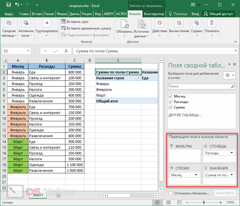 С помощью добавления и удаления полей в указанные области вы за считанные секунды сможете настроить любой срез ваших данных, какой пожелаете.