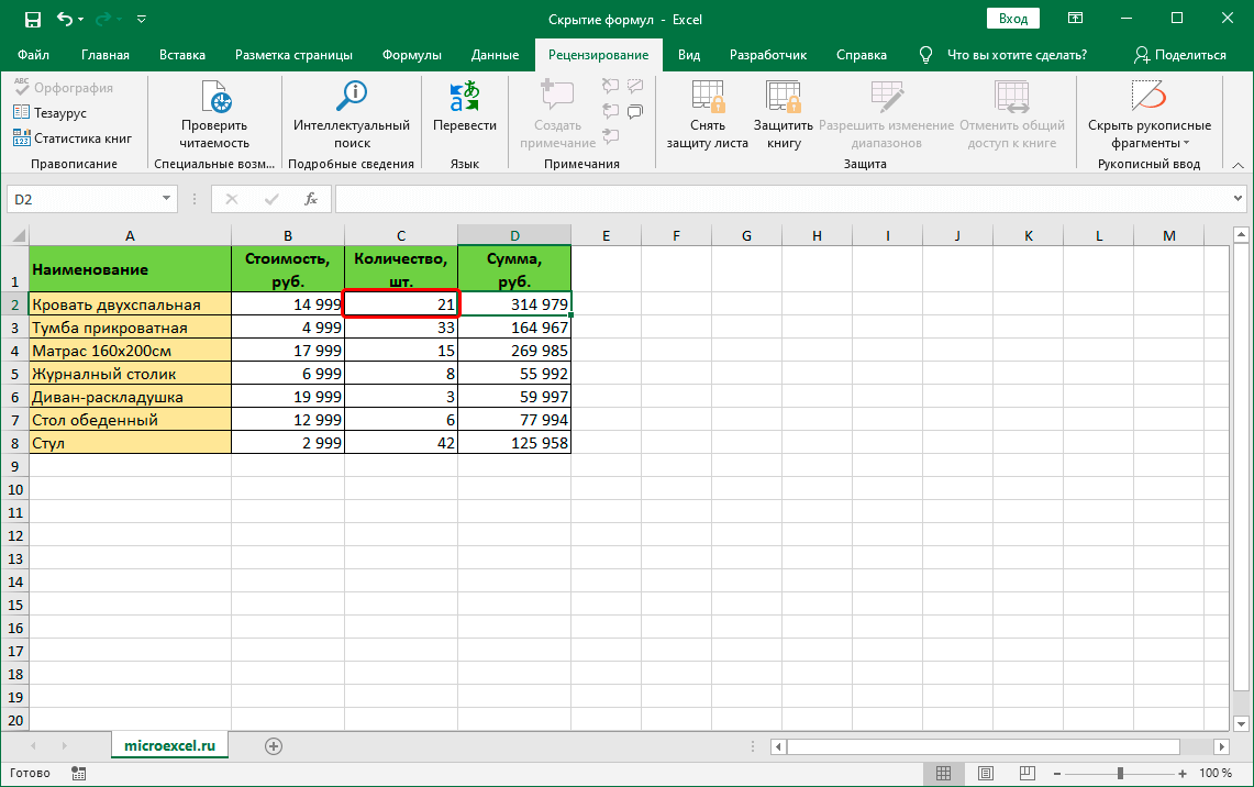 Например, в нашем случае мы можем скрыть формулу, но при этом оставить возможность менять количество по каждому наименованию и его стоимость. После того, как мы применим защиту листа, содержимое данных ячеек по-прежнему можно будет корректировать.
