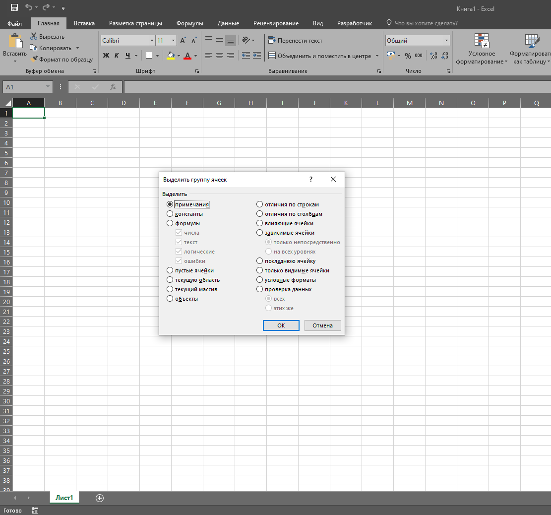 Если таблица слишком большая, то этот метод крайне неудобный. Чтобы упростить процесс поиска скрытых ячеек в документе, нужно перейти в комплекс команд «Редактирование» в меню «Главная». В категории «Найти и выделить» выбираем команду «Выделить группу ячеек…».