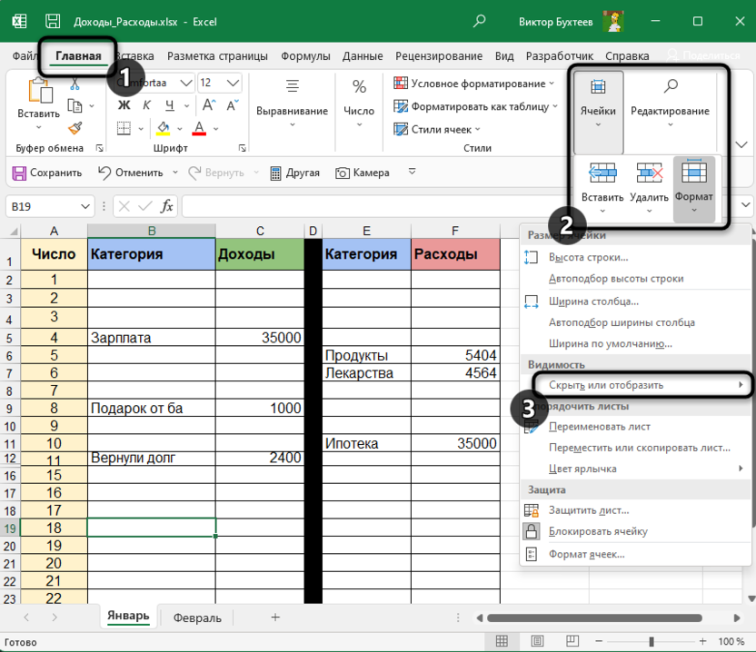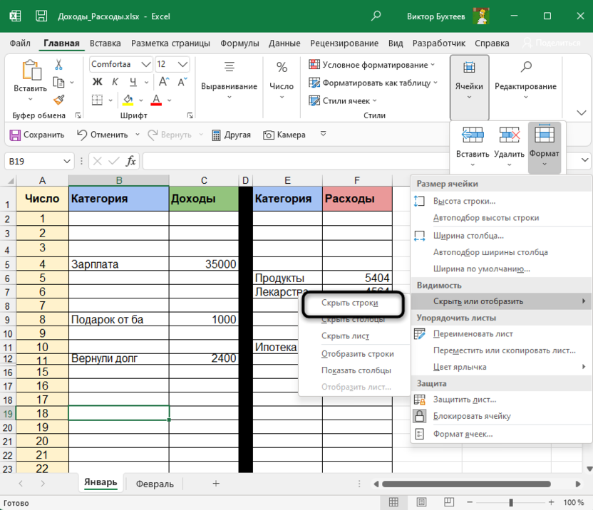 Предварительно выберите строки для скрытия точно так же, как это было показано в предыдущем варианте. Откройте ту самую вкладку, найдите блок «Ячейки», разверните меню «Формат» и наведите курсор на строку «Скрыть или отобразить».