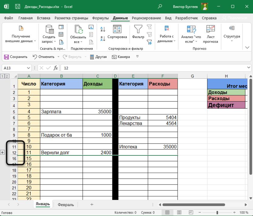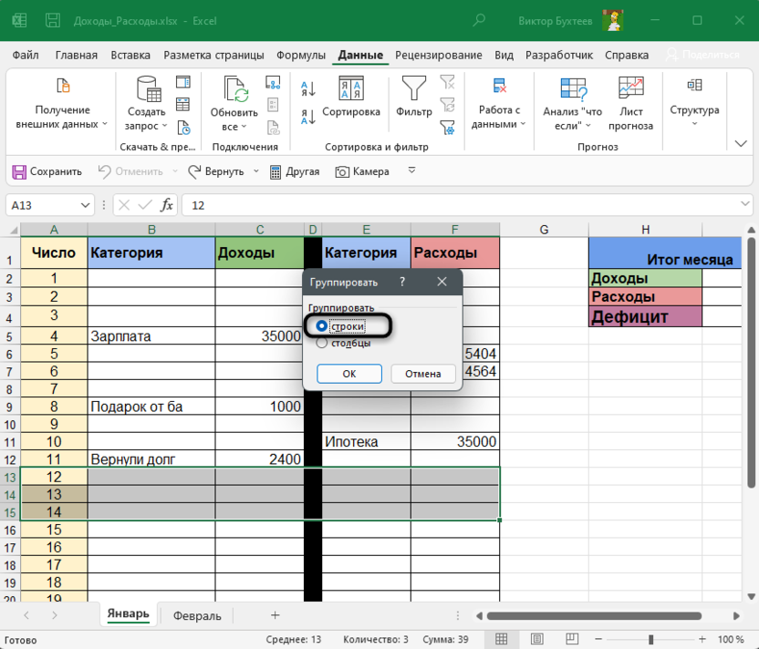Этот метод реализуется через функцию «Группировка». Следующий план действий: