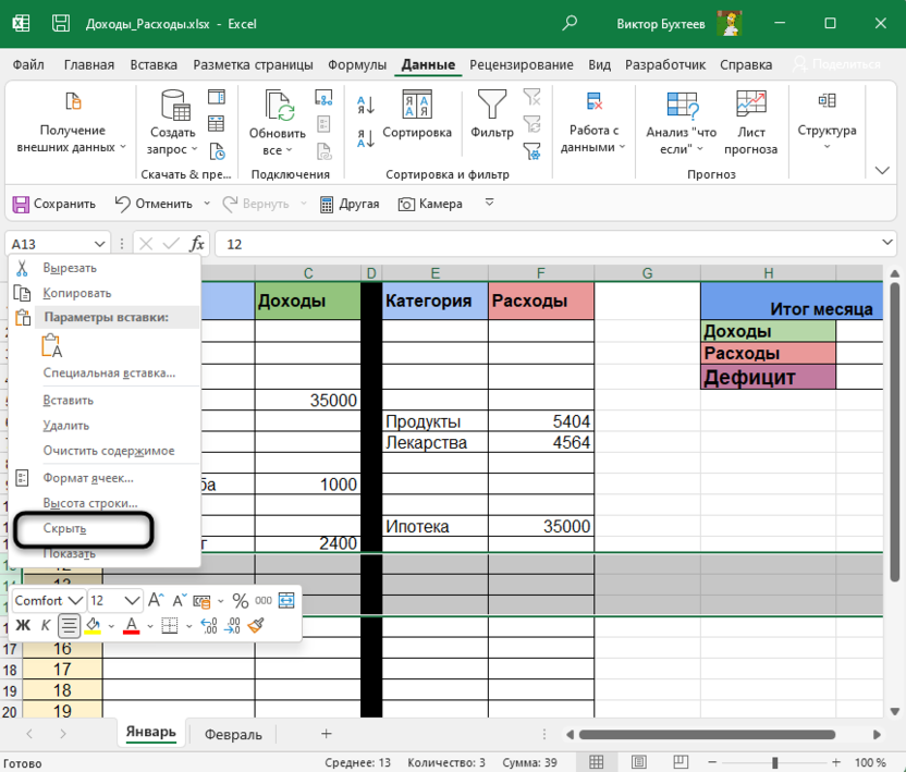 Обратите внимание на то, что скрытие прошло успешно. Показать строки можно через этот же список настроек или контекстное меню, как это было в Варианте 2