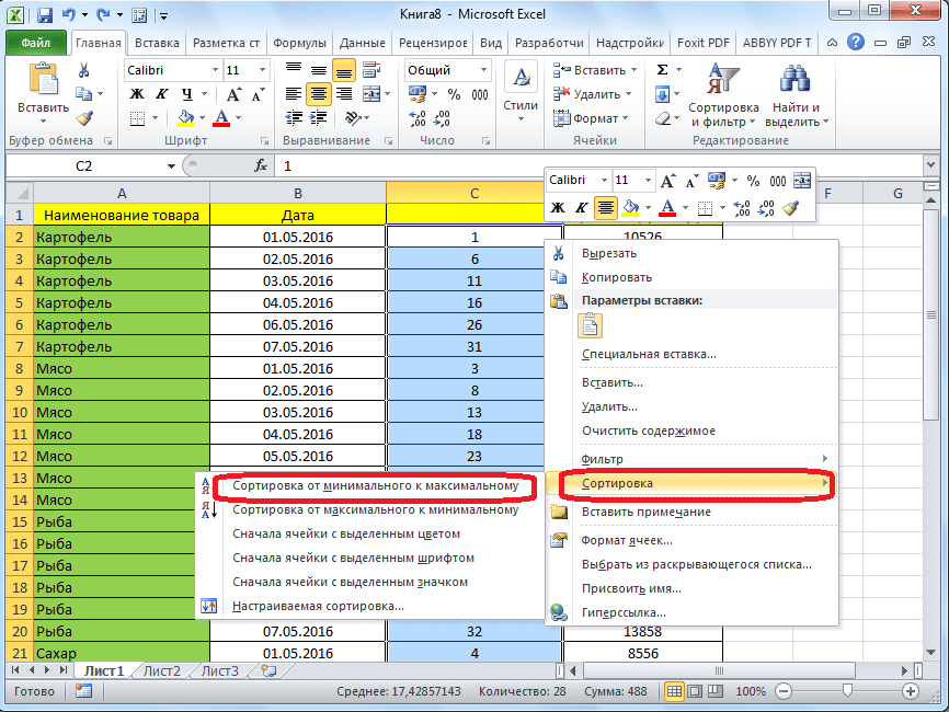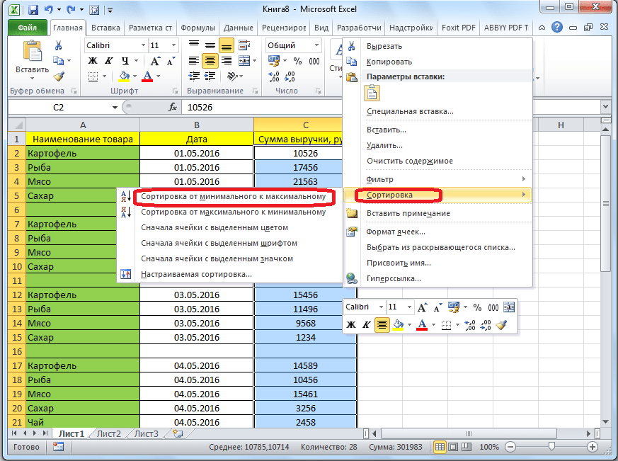 Выделяем всю табличную область. Кликаем по ней правой кнопкой мыши, и в контекстном меню выбираем пункт «Сортировка». После этого, появляется ещё одно меню. В нём нужно выбрать один из следующих пунктов: «Сортировка от А до Я», «От минимального к максимальному», или «От нового к старому». Какой именно из перечисленных пунктов будет находиться в меню, зависит от типа данных, которые размещены в ячейках таблицы.