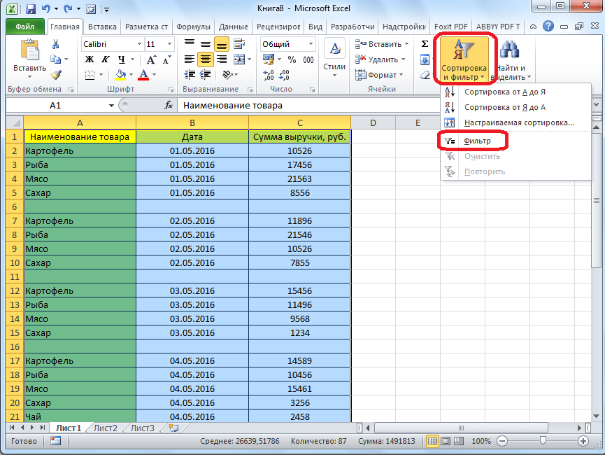 Этот способ также является простым и доступным абсолютно любому пользователю. Для применения фильтра на таблицу вам необходимо на вкладке «Главная» в разделе «Редактирование» нажимать кнопку «Сортировка и фильтр» и в открывшемся пункте меню выбираете «Фильтр».