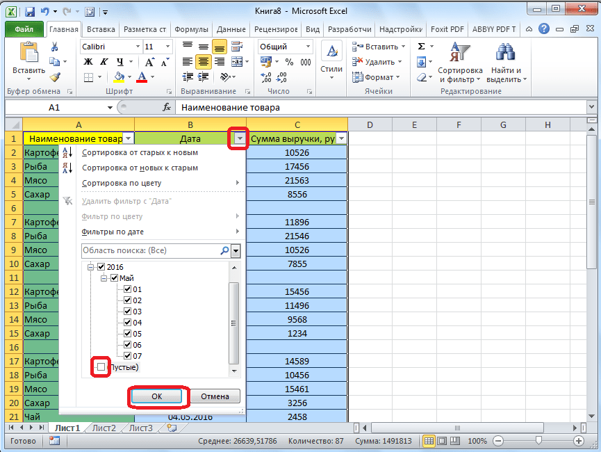 Ещё одним вариантом скрыть пустые ячейки является применение фильтра.