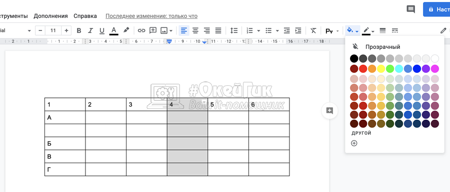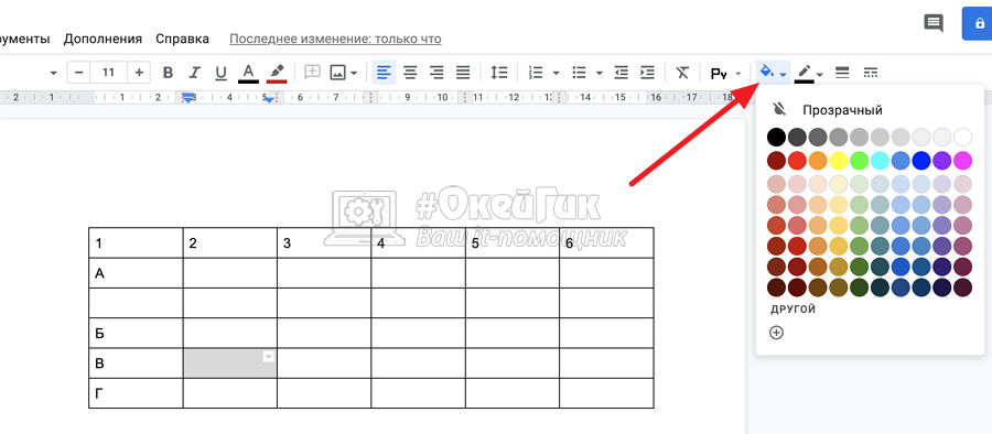 Часто при редактировании таблиц различные ячейки, столбцы, строки выделяют фоном, чтобы они отличались от других и было удобнее работать с такой таблицей. Чтобы в Google Docs выделить отдельную ячейку фоном, нажмите внутрь нее дважды левой кнопкой мыши и в верхнем меню выберите нужный цвет фона.