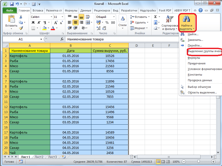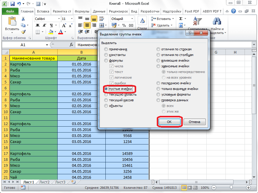 Наиболее простой способ удалить пустые элементы – это воспользоваться инструментом выделения групп ячеек.