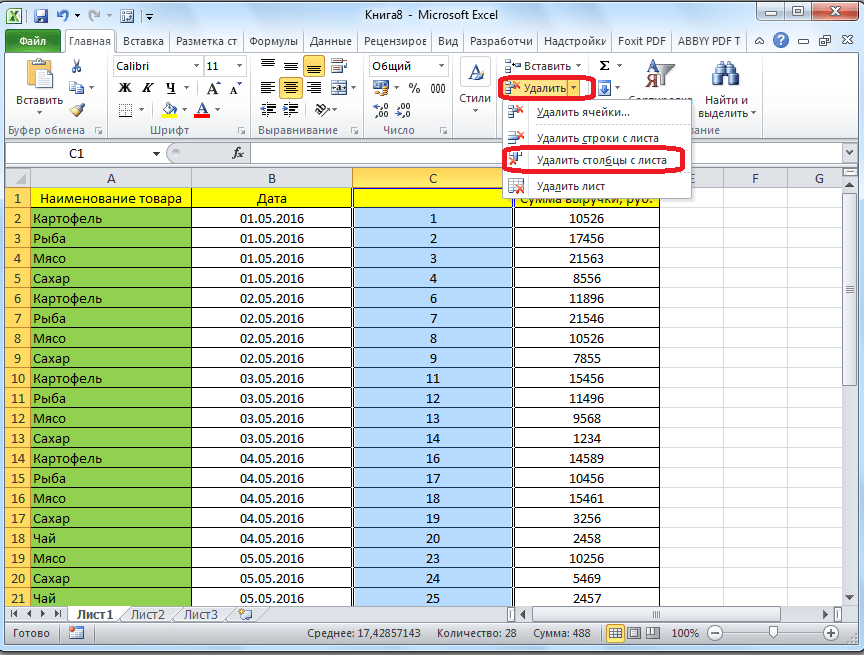 Как видим, строки выстроились в прежнем порядке, исключая пустые, которые удалены. Теперь, нам осталось только удалить добавленный столбец с порядковыми номерами. Выделяем этот столбец. Затем кликаем по кнопке на ленте «Удалить». В раскрывшемся меню выбираем пункт «Удалить столбцы с листа». После этого, нужный столбец будет удален.
