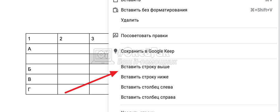 Чтобы вставить новую строку в таблице Google Docs, поставьте курсор в строке НАД или ПОД которой нужно вставить строку. Нажмите правой кнопкой мыши в этом месте и выберите нужный вариант — “Вставить строку выше” или “Вставить строку ниже”.