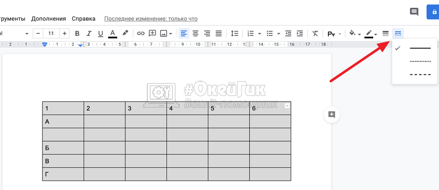 Чтобы сделать границы таблицы в Google Docs пунктирными, выделите всю таблицу (или отдельный ее участок), и на панели инструментов справа появится “Стиль границ”. Нажмите на этот пункт и выберите нужный стиль для границ таблицы.