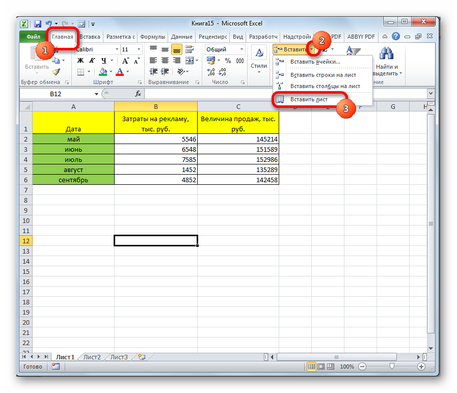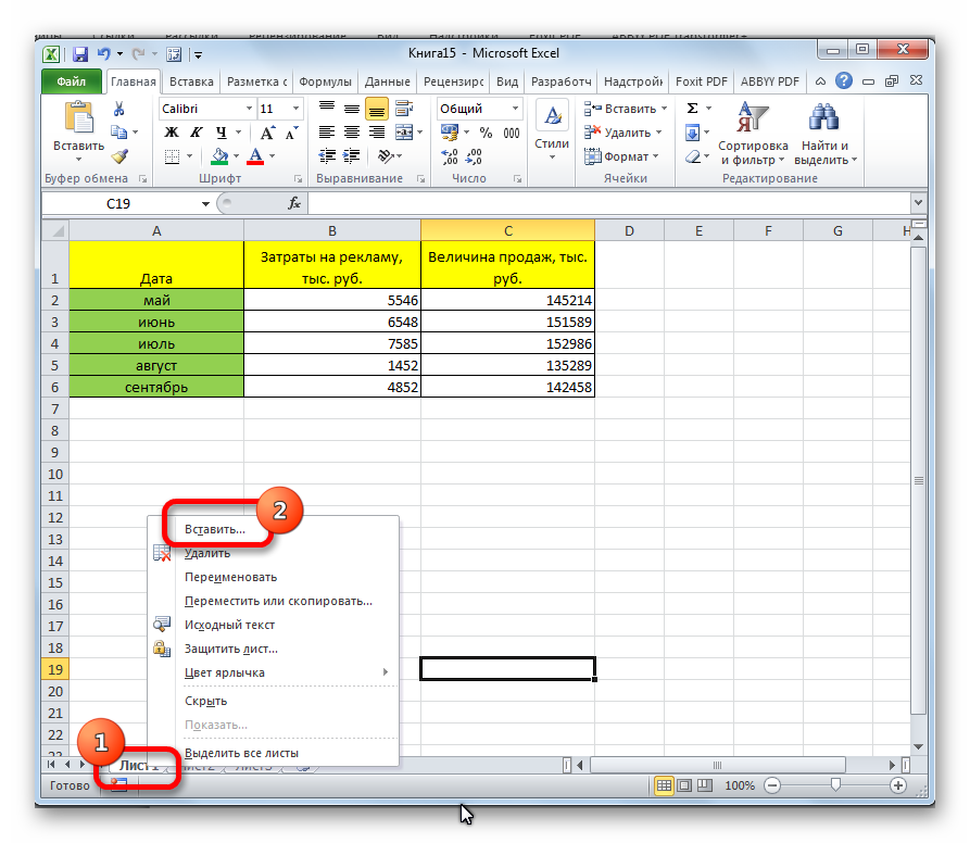 Ещё одна возможность создать новый лист предполагает использование инструментов, которые размещены на ленте.
