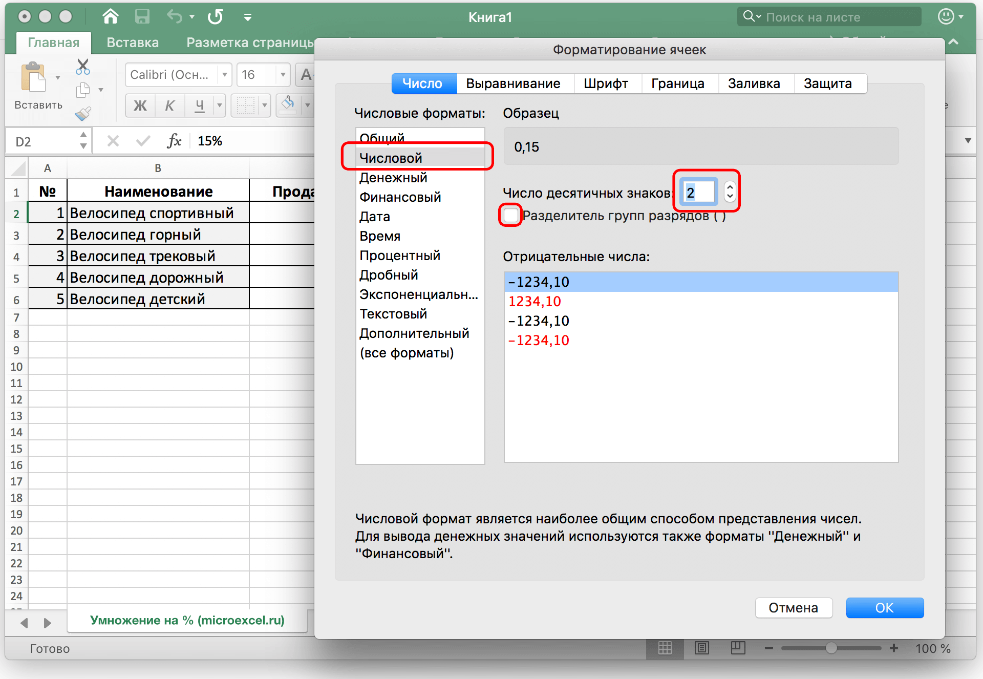 Также, в этом же разделе можно выбрать “Числовой” формат, при котором проценты будут отображаться в виде десятичных дробей, а само значение процента автоматически будет пересчитано (т.е. вместо 15% будет отображаться 0,15).