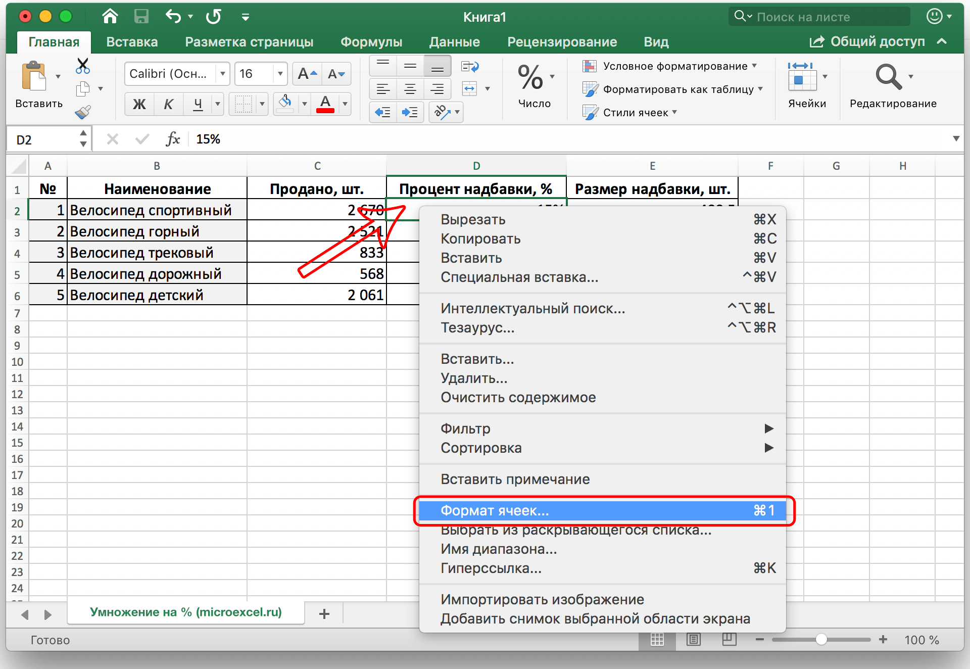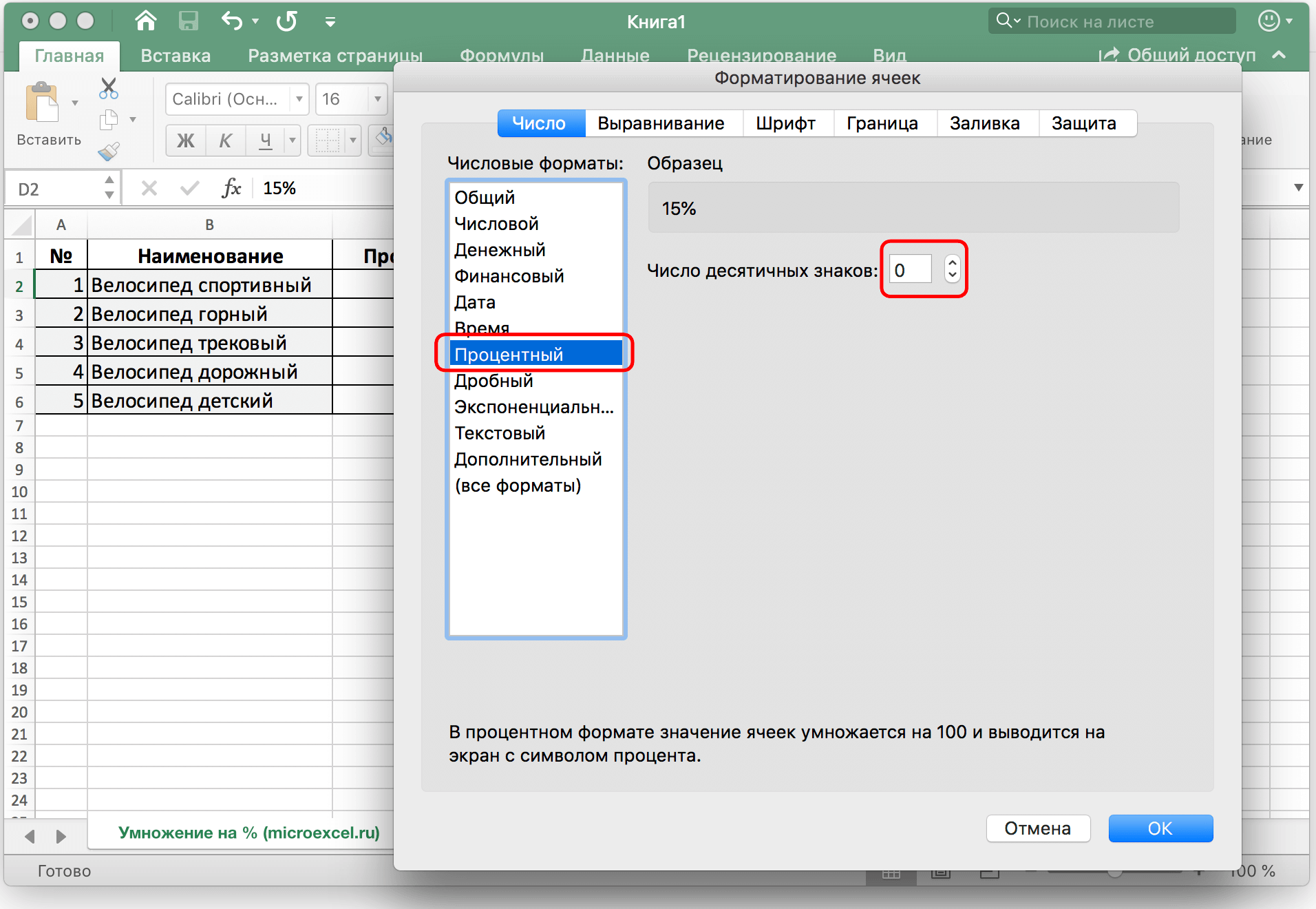 Выбрать процентный формат для ячейки можно четырьмя способами: