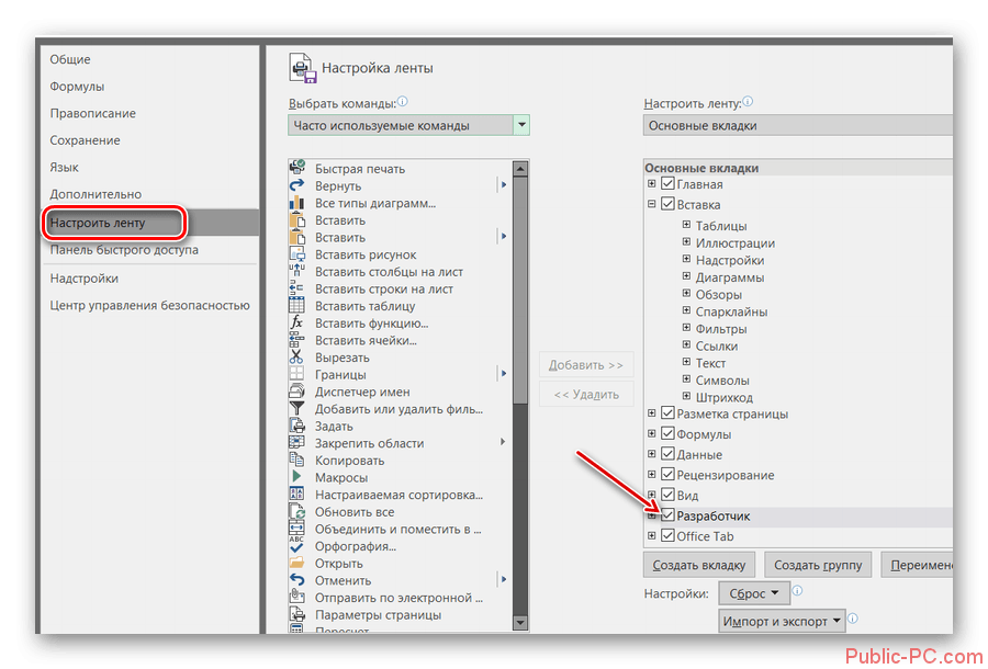 Для этого необходимо кликнуть по меню «Файл», далее перейти в «Параметры», а затем в «Настройку ленты». С правой стороны будет находиться список, среди предложенных вариантов пользователь может выбрать те меню, в которых он наиболее часто будет нуждаться, а потому желает, чтобы они постоянно были отображены на панели инструментов. В частности, в этот момент необходимо установить переключатель на строке «Разработчик» и нажать «Ок». После этого данное меню отобразится в верхней части Excel 2010.
