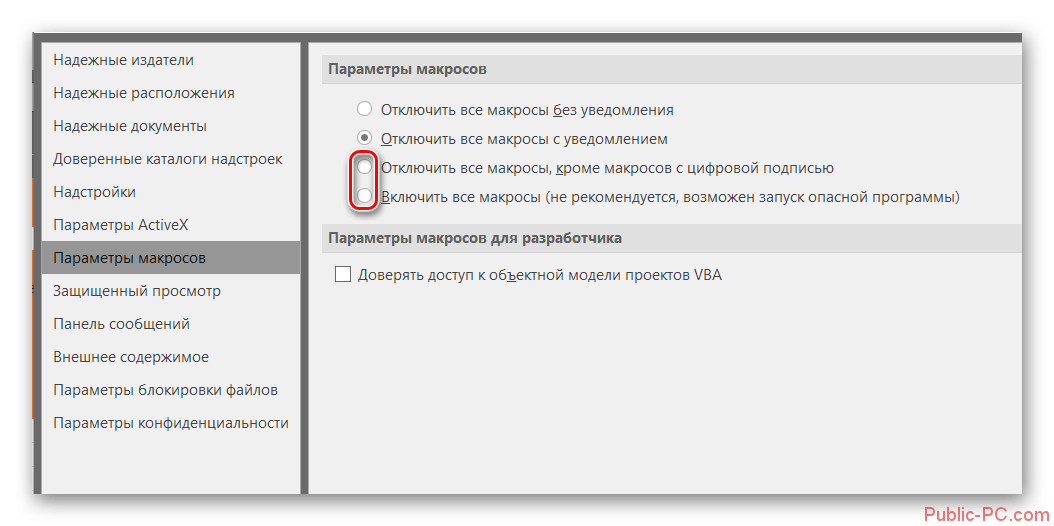 После сохранения макросы содержат пять параметров работы, необходимых для обеспечения защищенности при взаимодействии с ними, так как включить макросы в Excel легко, а избавляться от вирусов – нет.