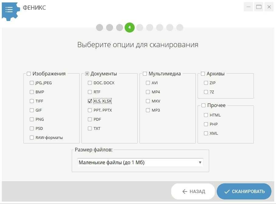 Нажмите «Далее» и в перечне форматов оставьте галочки напротив xls, xlsx. Помните размер файла? Укажите его в соответствующем поле. Это ускорит процесс.