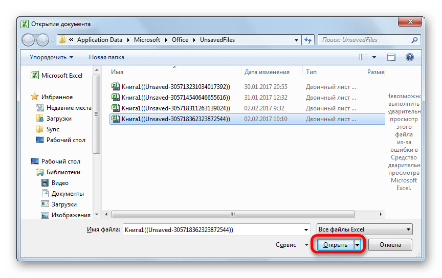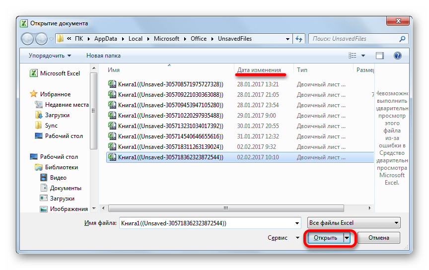 Какой бы из этих путей вы не выбрали, после данных действий открывается список последних несохраненных книг. Естественно, что название им присвоено автоматически. Поэтому то, какую книгу нужно восстановить, пользователь должен вычислить по времени, которое расположено в колонке «Дата изменения». После того, как нужный файл выбран, жмем на кнопку «Открыть».