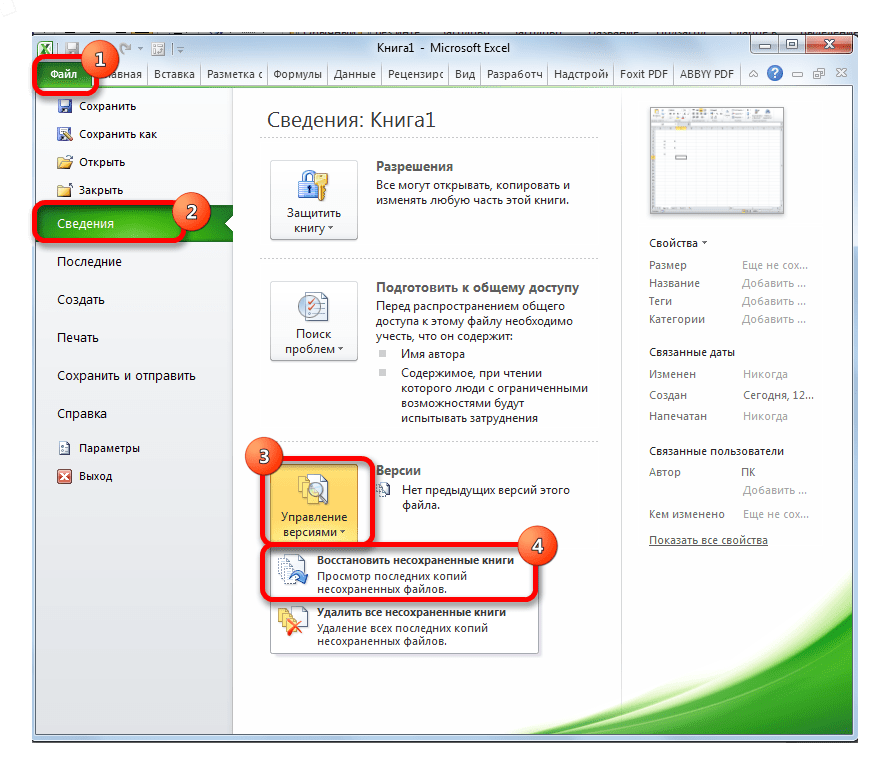 Чтобы восстановить книгу, которую вы закрыли без сохранения, выберите Файл ► Сведения. В разделе Версии нажмите кнопку Управление версиями и в меню выберите команду Восстановить несохраненные книги. Вы увидите список всех версий-черновиков книг. Вы можете открыть их и (будем надеяться) восстановить то, что вам нужно. Эти черновики также содержатся в списке последних файлов, отображаемом при выборе Файл ► Последние. Помните, что черновики удаляются по истечении четырех дней или пока вы не отредактируете файл.