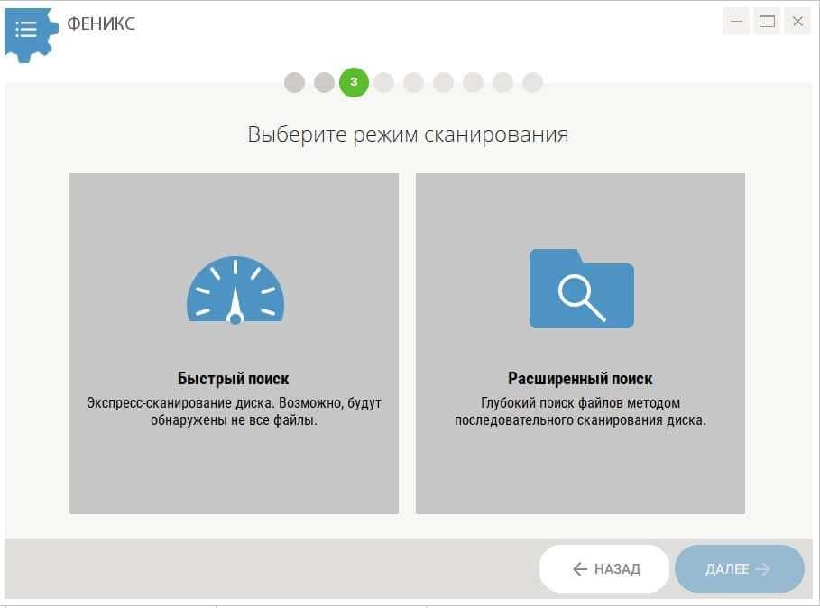 Нажмите «Далее» и выберите режим сканирования. Файлы удалены недавно или флешка не слишком набита информацией? Хватит и «Быстрого поиска».