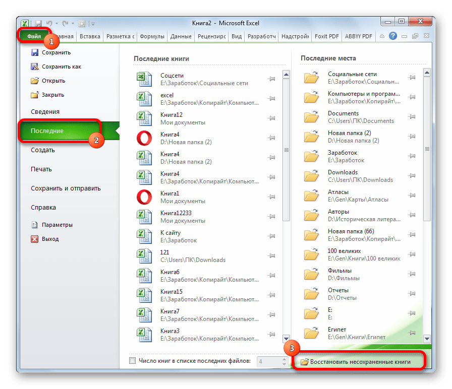 Иногда вы сами отказались от сохранения документа, поэтому способ выше вам не поможет, но есть другая возможность. Если во вкладке «Файл» вашей версии Excel имеется пункт «Последние», выберите там «Восстановить несохраненные данные». Откроется список книг, которые вы отказались сохранять при последних изменениях. Щелкните на необходимой книге, сохраняйте еë под нужным именем и пользуйтесь.
