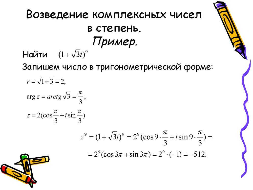 Для возведения в степень можно воспользоваться формулой Муавра (так названа в честь английского математика Абрахама де Муавра):