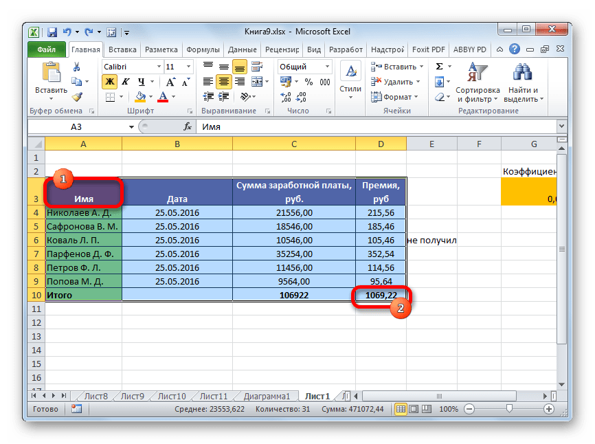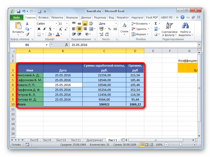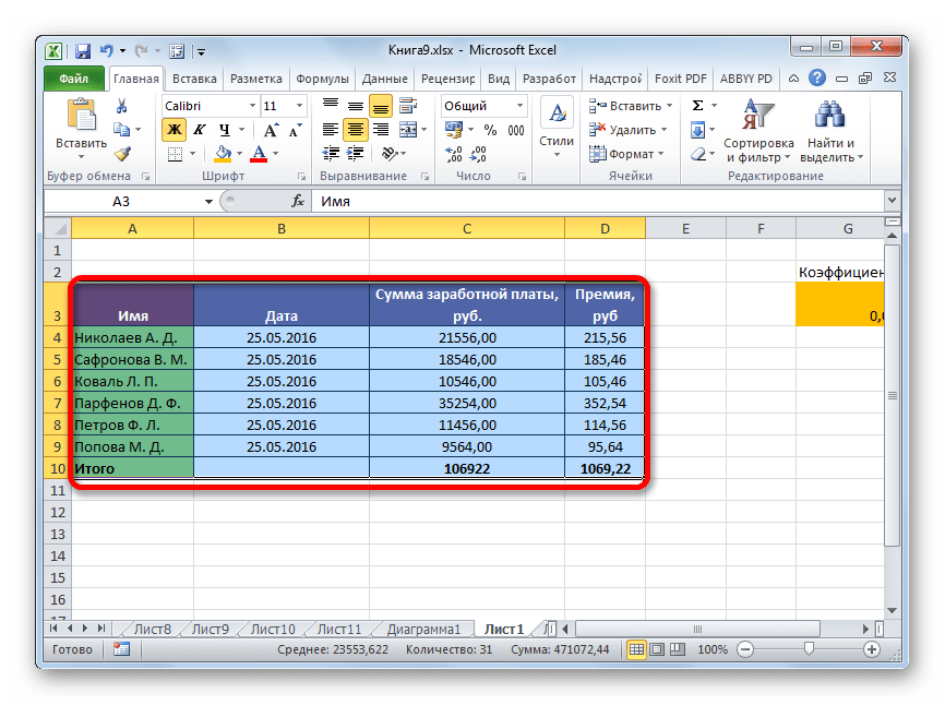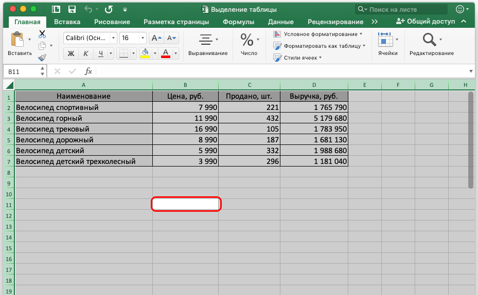 Выделение таблицы в Microsoft Excel