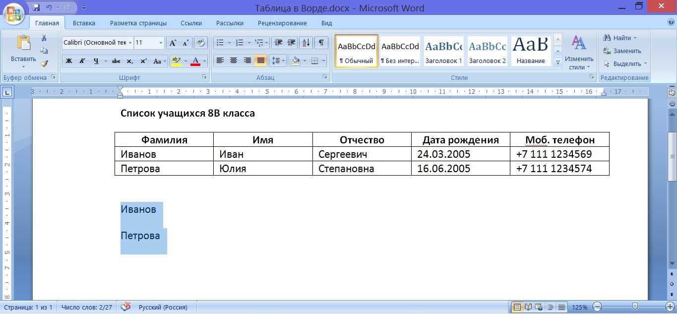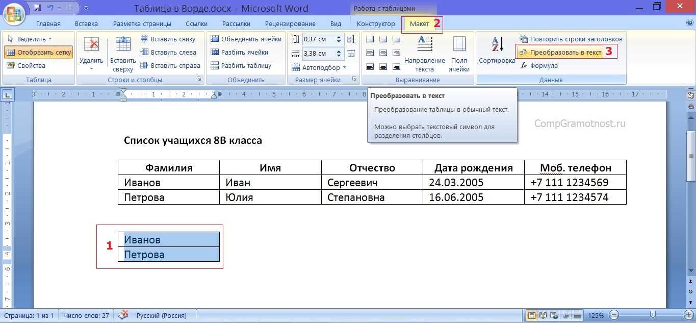Теперь с той частью таблицы, куда вынесены только фамилии учеников, можно отдельно что-либо делать, не затрагивая основную таблицу. Например, давайте «вытащим» эти 2 фамилии из таблицы, сделаем фамилии не в виде таблицы, а в виде обычного текста. Данная процедура называется «преобразование таблицы в текст».