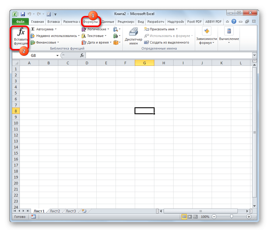 Вы также можете запустить выбранный вами инструмент, перейдя на вкладку «Формулы». Затем нажмите на кнопку «Вставить функцию» в левой части ленты. Он находится в панели инструментов «Библиотека функций». Этот способ хуже предыдущего, так как если вы не находитесь на вкладке «Формулы», вам придется выполнять дополнительные операции.