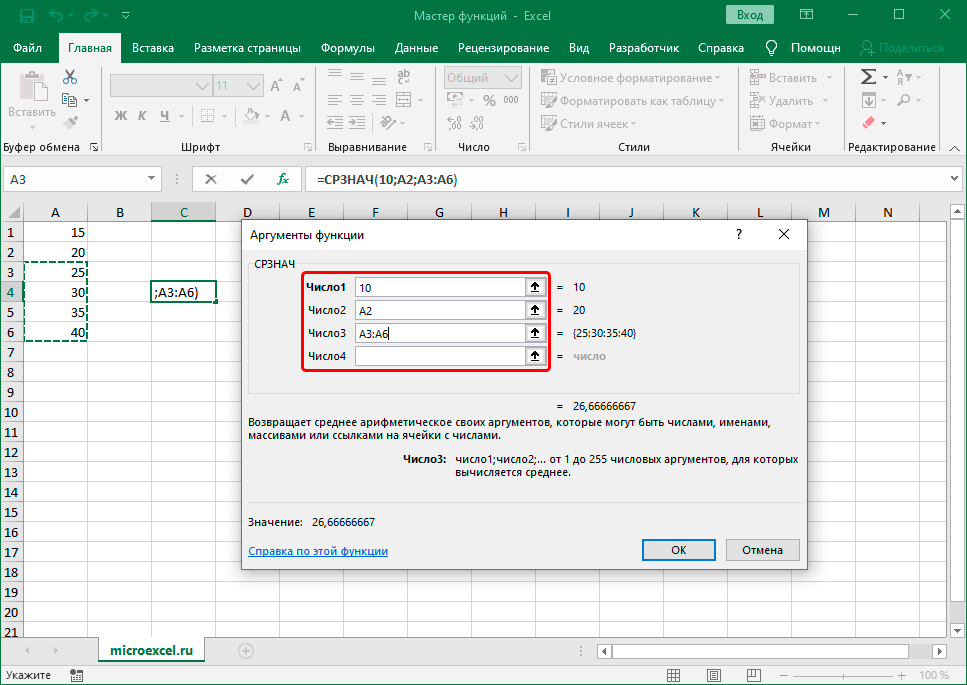 Рассмотрим на примере “СРЗНАЧ” (для вычисления среднего арифметического значения), работающего с числовыми данными.