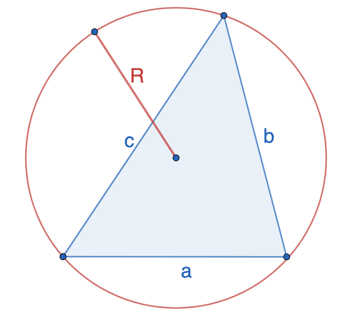 Площадь треугольника по радиусу описанной окружности и трем сторонам — расчет: