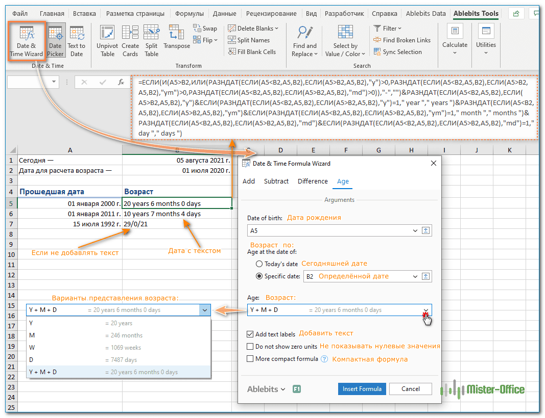 Либо вовсе не добавляйте текст и получите возраст в виде текста «лет/месяцев/дней» (см. ячейку B7 на скриншоте выше).