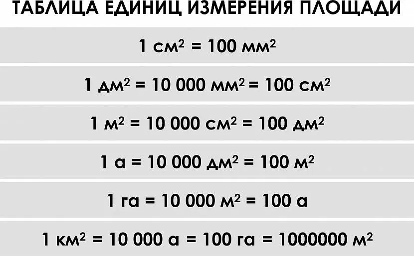 | 1 км 2 | 100 га | 10 000 ар | 1 000 000 м 2 | 1 000 000 000 см 2 |