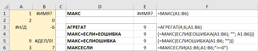 Чтобы упростить формулу, используйте функцию ЕСЛИОШИБКА вместо комбинации ЕСЛИ + ЕОШИБКА. Это также сделает логику более очевидной — если есть ошибка в A1:B6, замените ее пустой строкой (»), а затем вычислите самое большое значение в диапазоне: