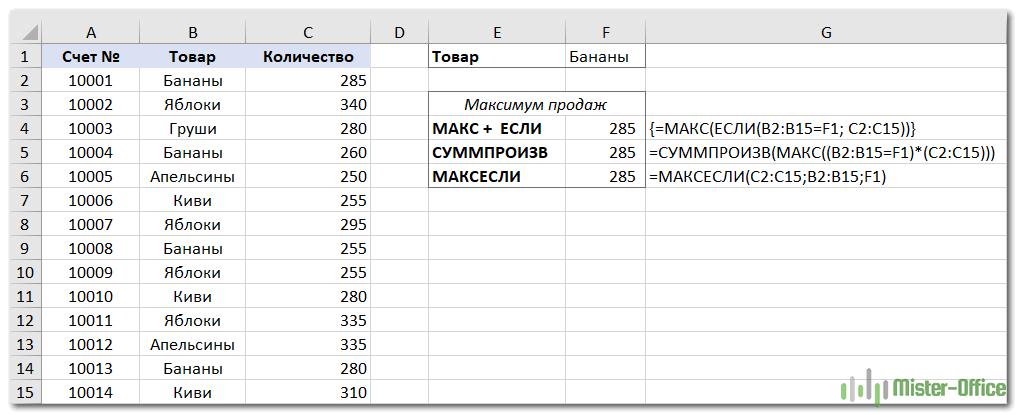 Если вы хотите получить максимальное значение Excel с учётом каких-то условий, то вы можете выбрать из нескольких предложенных ниже формул. Чтобы убедиться, что все они возвращают одинаковый результат, мы протестируем их на одном и том же наборе данных.