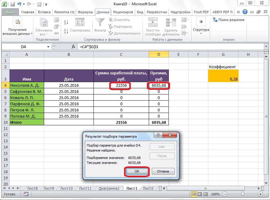 Имеем таблицу выплат заработной платы и премии работникам предприятия. Известны только премии работников. Например, премия одного из них — Николаева А. Д, составляет 6035,68 рублей. Также, известно, что премия рассчитывается путем умножения заработной платы на коэффициент 0,28. Нам предстоит найти заработную плату работников.