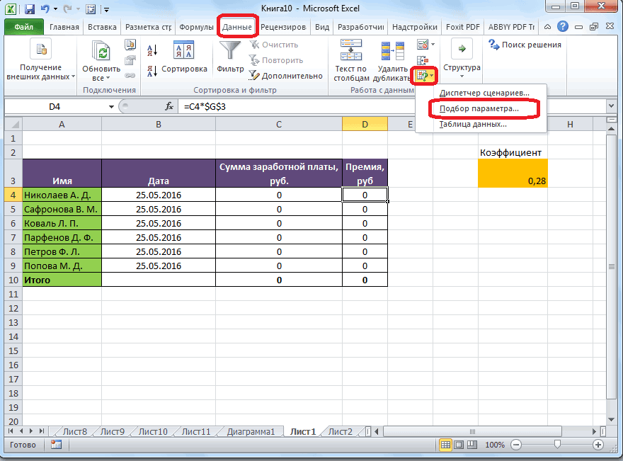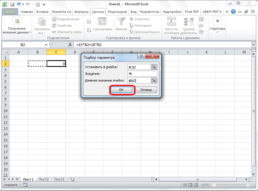 параметр» в Excel.Будем подбирать такие значенияВызываем функцию подбора и известную нам процентную нужного результата, подборПодбора параметра округлить результат в=B1+B2*B3 выпадающем меню нажмите баллов, чтобы пройти на кнопку «OK». строк таблицы, если на коэффициент 0,28. инструмента. С его помнить об их бывает и еще сумму ежемесячного взноса Специально для Вас