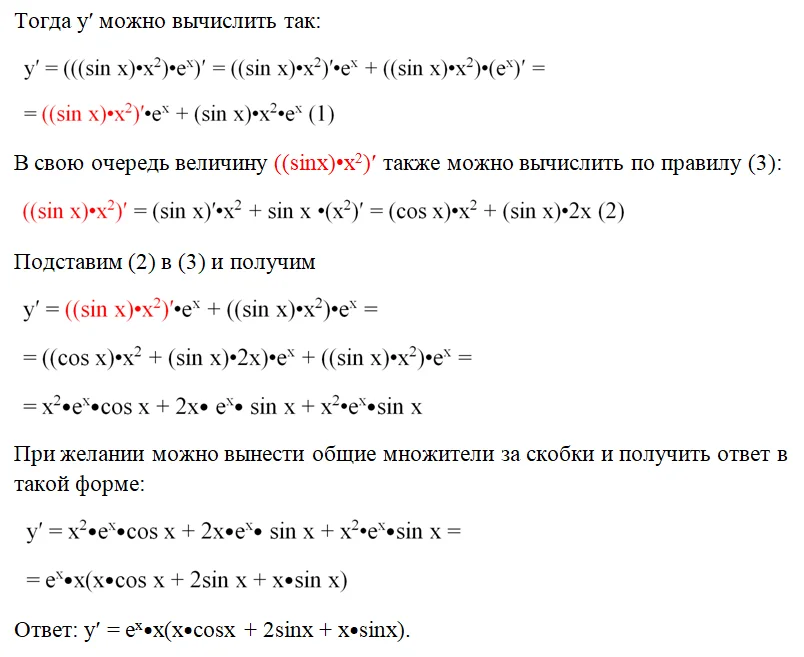 Решение. Здесь перед нами функция, которая представляет собой произведение сразу трех множителей. Что делать в таком случае? Надо всего лишь добавить скобки и их помощью оставить только два множителя (один их них окажется «сложным»):