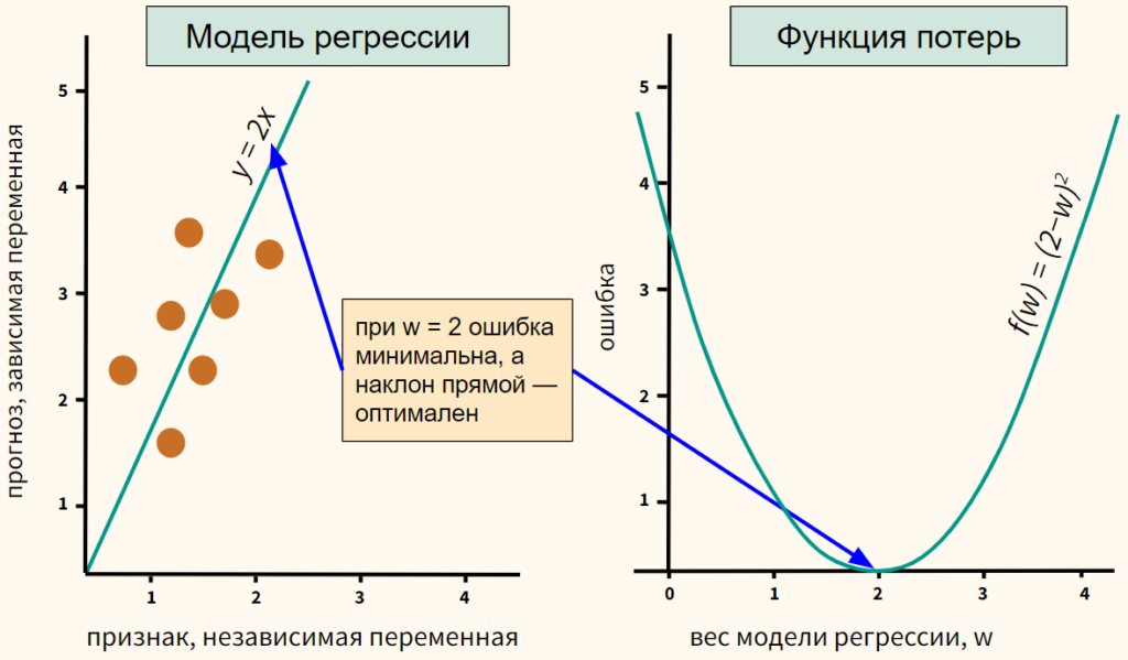 Как они связаны? Там где при определенном весе w значение функции потерь (т.е. ошибка) минимально, вес (а значит и наклон прямой) основной функции оптимален. Из графика очевидно, что идеальным весом с минимальной ошибкой, а значит и наклоном линии регрессии будет w = 2.