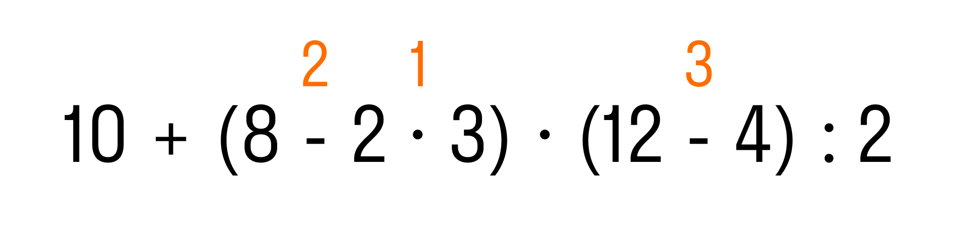, формулируется так: сначала выполняются действия в скобках, при этом также по порядку слева направо выполняется умножение и деление, затем – сложение и вычитание.