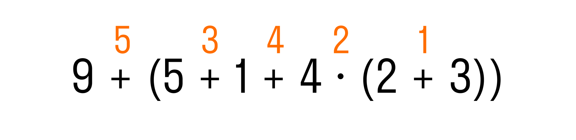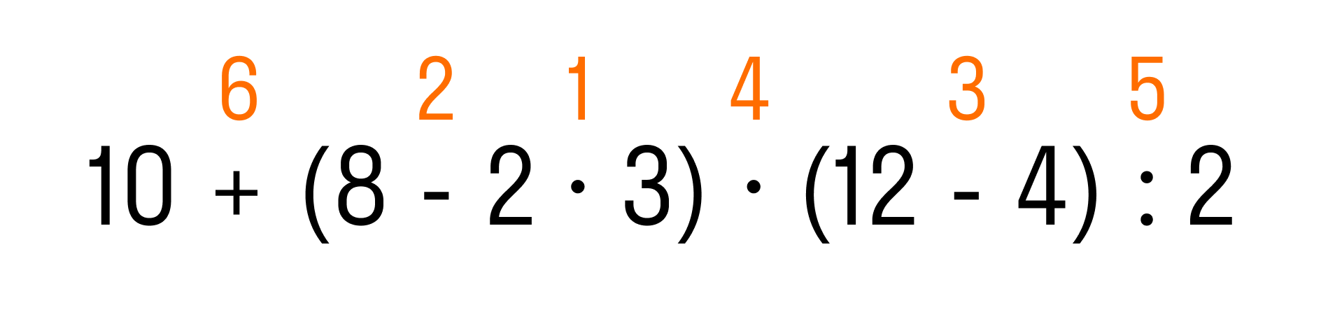 Рассмотрим несколько примеров применения этого правила. Для примеров будем брать простейшие числовые выражения, чтобы не отвлекаться на вычисления, а сосредоточиться именно на порядке выполнения действий.