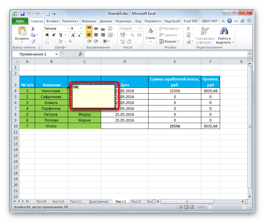 После этого примечание добавляется к ячейке, и любой человек, у кого есть этот документ, может посмотреть его у себя.