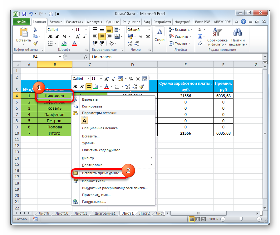 - Кликнуть правой клавишей манипулятора по ячейке, в которой надо прописать примечание.