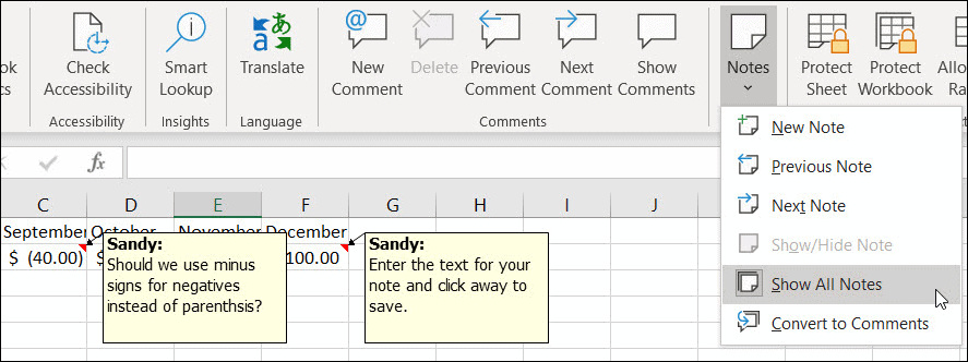 Если вы хотите увидеть все заметки в электронной таблице сразу, перейдите на страницу Обзор вкладку и нажмите Примечания в ленте. Выбирать Показать все примечания. Чтобы снова скрыть их, нажмите «Показать все заметки», чтобы отменить выбор.
