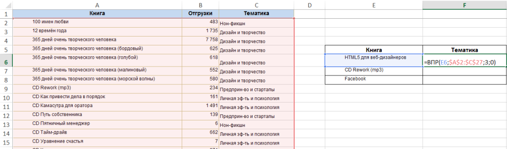 В данном случае мы хотим в дополнительной таблице справа получить значения тематик для отобранных книг, не занимаясь поиском вручную.