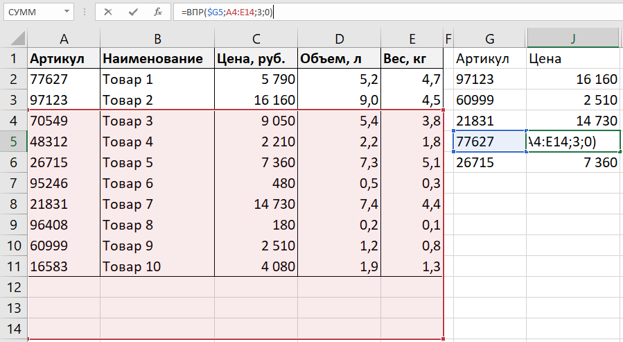 В нашем случае, к примеру, если мы хотим искать по наименованию (которые находятся в столбце B), то в качестве таблицы нужно выбирать диапазон B1:E11 (не A1:E11), так как именно по столбцу B будет делаться поиск и именно он является первым столбцом в таблице B1:E11.
