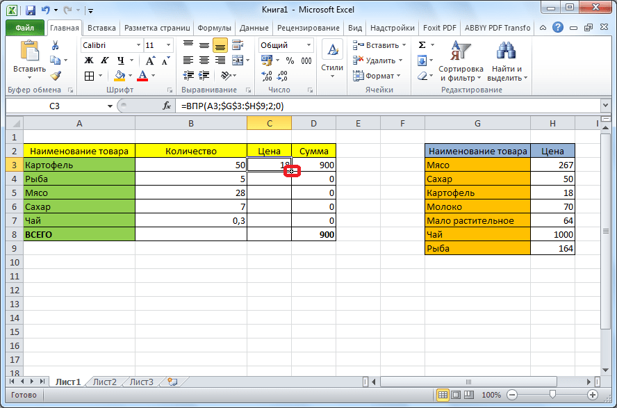 Как видим, цена картофеля подтянулась в таблицу из прайс-листа. Чтобы не проделывать такую сложную процедуру с другими товарными наименованиями, просто становимся в нижний правый угол заполненной ячейки, чтобы появился крестик. Проводим этим крестиком до самого низа таблицы.
